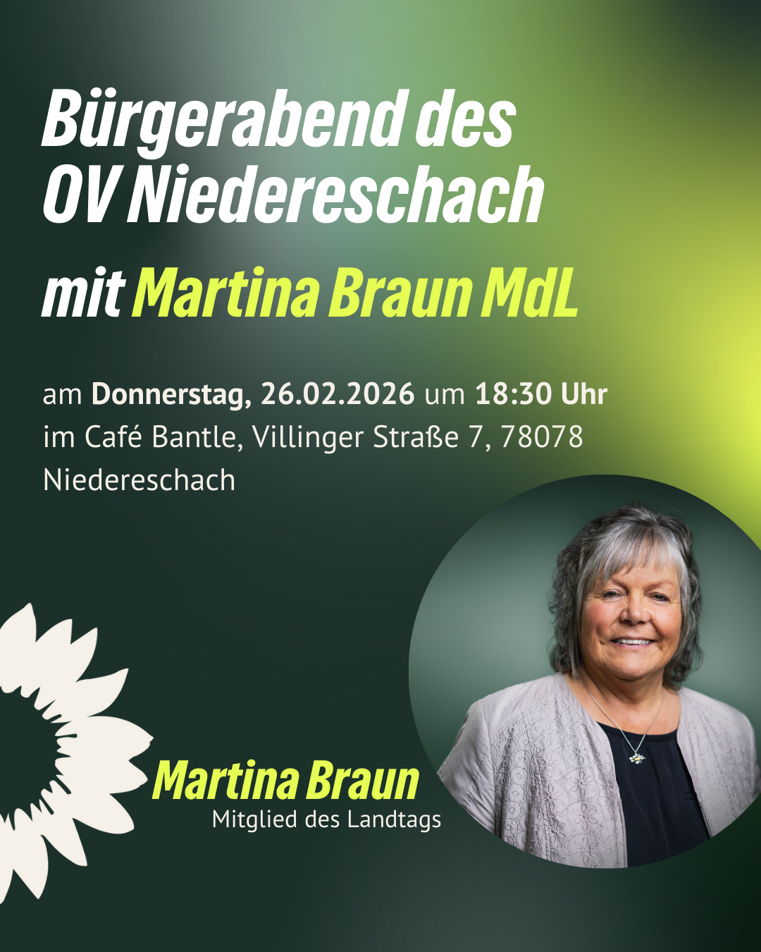 Der OV Niedereschach lädt herzlich zum Bürgerabend mit Martina Braun MdL am Donnerstag, 26.02.2026 um 18:30 Uhr ins Café Bantle nach Niedereschach ein.
